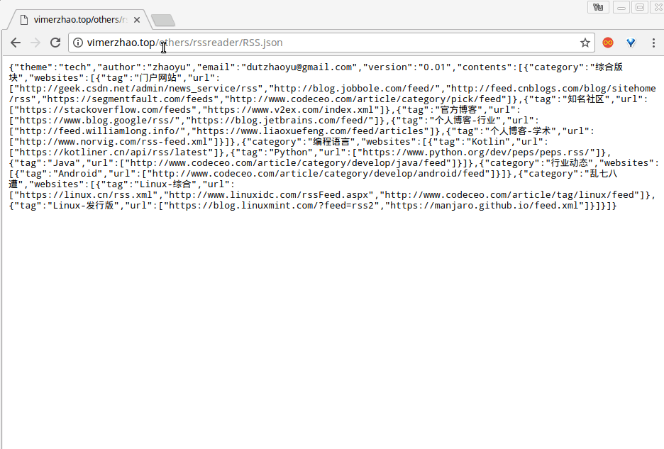 {"theme":"tech","author":"zhaoyu","email":"dutzhaoyu@gmail.com","version":"0.01","contents":[{"category":"综合版块","websites":[{"tag":"门户网站","url":["http://geek.csdn.net/admin/news_service/rss","http://blog.jobbole.com/feed/","http://feed.cnblogs.com/blog/sitehome/rss","https://segmentfault.com/feeds","http://www.codeceo.com/article/category/pick/feed"]},{"tag":"知名社区","url":["https://stackoverflow.com/feeds","https://www.v2ex.com/index.xml"]},{"tag":"官方博客","url":["https://www.blog.google/rss/","https://blog.jetbrains.com/feed/"]},{"tag":"个人博客-行业","url":["http://feed.williamlong.info/","https://www.liaoxuefeng.com/feed/articles"]},{"tag":"个人博客-学术","url":["http://www.norvig.com/rss-feed.xml"]}]},{"category":"编程语言","websites":[{"tag":"Kotlin","url":["https://kotliner.cn/api/rss/latest"]},{"tag":"Python","url":["https://www.python.org/dev/peps/peps.rss/"]},{"tag":"Java","url":["http://www.codeceo.com/article/category/develop/java/feed"]}]},{"category":"行业动态","websites":[{"tag":"Android","url":["http://www.codeceo.com/article/category/develop/android/feed"]}]},{"category":"乱七八遭","websites":[{"tag":"Linux-综合","url":["https://linux.cn/rss.xml","http://www.linuxidc.com/rssFeed.aspx","http://www.codeceo.com/article/tag/linux/feed"]},{"tag":"Linux-发行版","url":["https://blog.linuxmint.com/?feed=rss2","https://manjaro.github.io/feed.xml"]}]}]}
