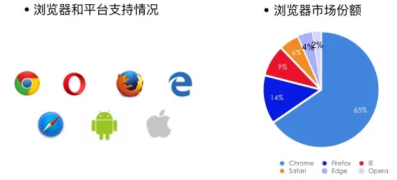 我们看一下这几个浏览器在市场上的占有情况,不难看出,现在除了占百分之8点几的IE之外不支持,其他的其实都已经支持了。