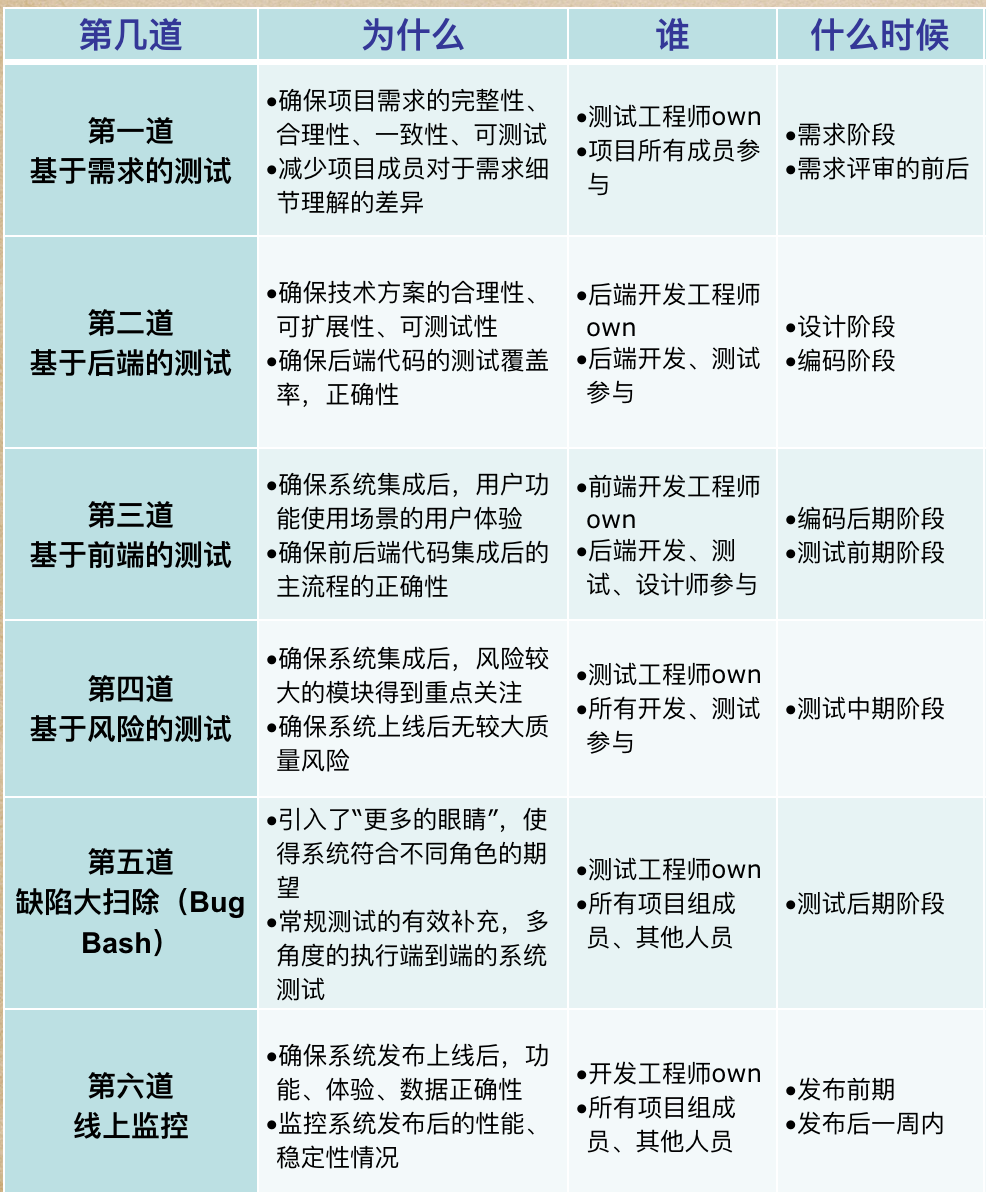 好吧,前面太啰嗦了,现在回到正题了,这两个月我确实思考了很多,包括看了自己之前写的一些blog,从中选取一些很好的想法,加上自己看到的一些变化。最后,我思考了一个六道网质量防控体系,肯定会存在一些问题,后续一些想法和思考都会围着这个体系来建设,从而完善它,真正的把它做好,真正的服务到整个项目团队成员。 why-六道网质量防控体系 首先说下,为什么会有这样的一个六道网质量防控体系呢,因为我们想: 全方位多角度的测试活动来保障系统质量 改变传统模式下的开发测试工作方式 提升研发团队的测试成熟度,助力组织升级