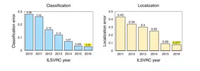 图 2:ILSVRC 竞赛中,分类/定位的逐年错误率,来源 Jia Deng (2016),ILSVRC2016。