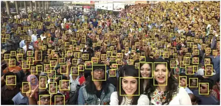 图 3:仅有人脸一个类别的目标检测。图为人脸检测的一个示例,作者表示目标识别的一个问题是小物体检测,检测图中较小的人脸有助于挖掘模型的尺度不变性、图像分辨率和情景推理的能力,来源 Hu and Ramanan (2016, p. 1)[21]。