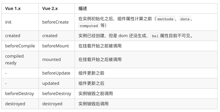 生命周期钩子也是这次升级中比较大的改进点,对照 vue1.0文档 和 vue2.0 文档 ,异同如下表格: