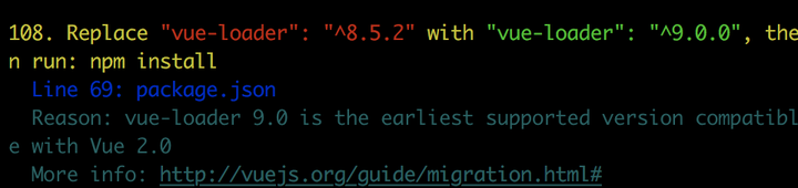 npm install --global vue-migration-helperCLI 工具来帮助项目从Vue 1.x 迁移到 2.x。 它扫描文件以查找特定于 Vue 的代码,并对需要升级的代码提供详细的警告。vue-migration-helper的介绍说明告诉我们它大概能捕获 80% 的升级帮助信息,而不是全部。所以终端输出的帮助信息并不是完全正确的,在升级时不要盲目copy & paste,还是要根据实际情况去改写。 - 进入当前的项目:运行: