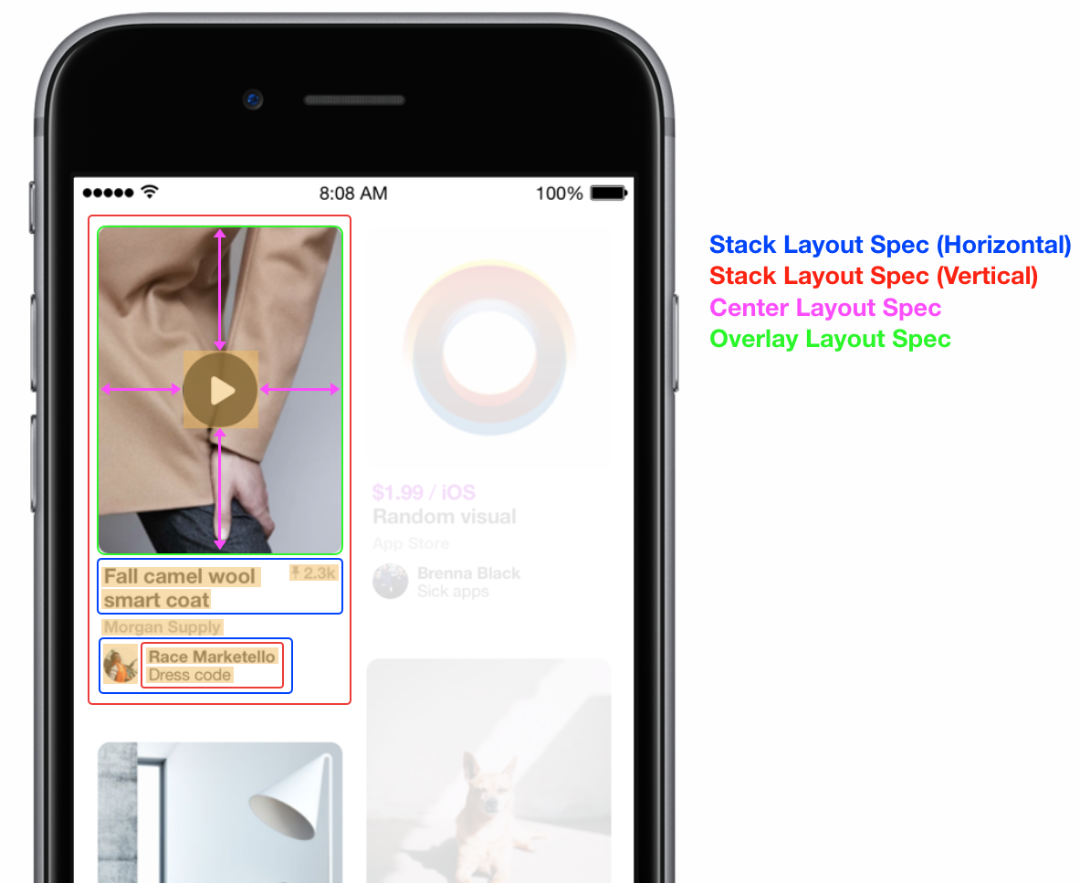 在这里,你可以看到黄色突出显示的 ASTextNodes,顶部图像 ASVideoNode 和盒子布局规则 ASStackLayoutSpec 是如何组合并创建了一个复杂界面。