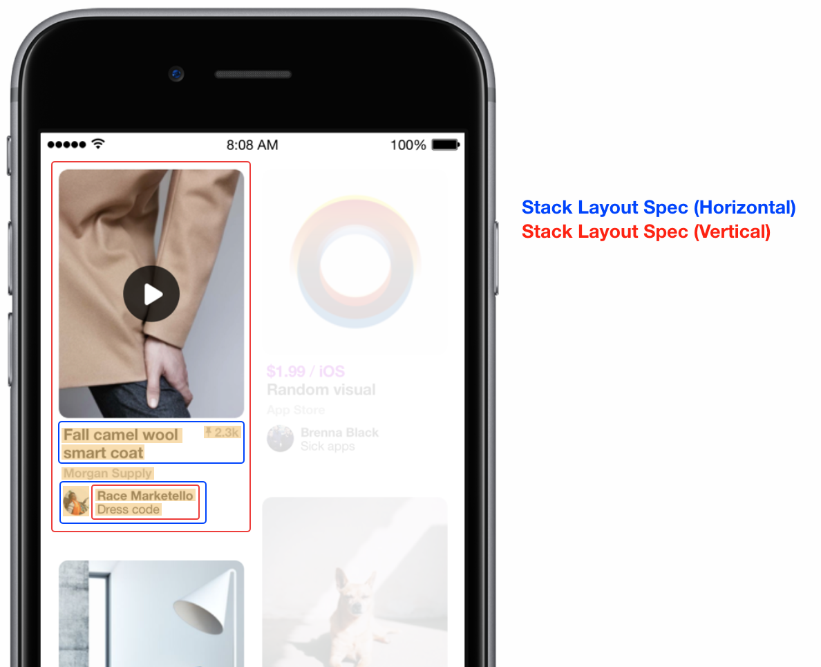 所有的 ASDisplayNode 和 ASLayoutSpec 都遵守 <ASLayoutElement> 协议,这意味着你可以通过两个 Nodes 和其他的 LayoutSpecs,生成或者组合一个新的 LayoutSpecs。