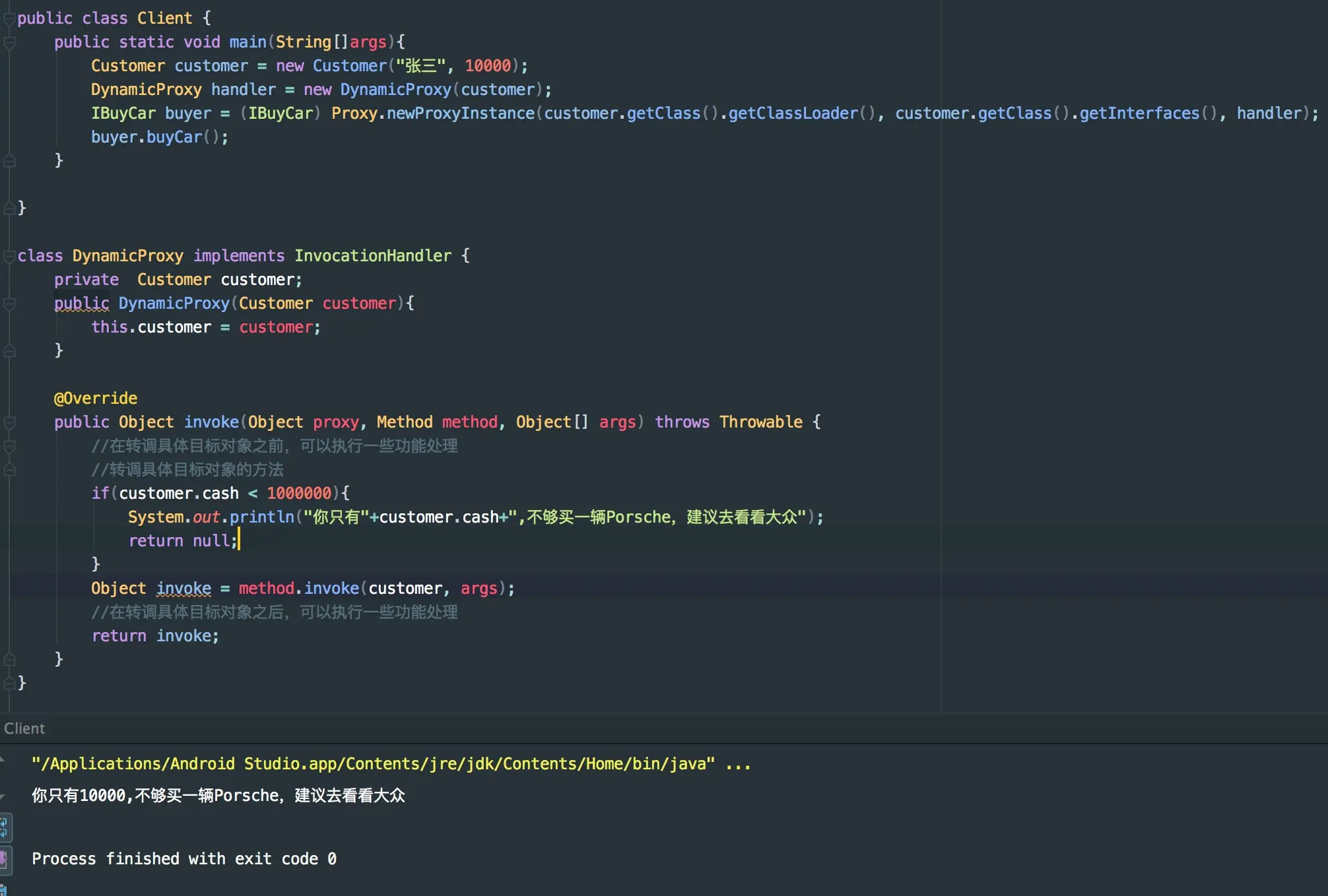 IBuyCar customer = (IBuyCar)Proxy.newProxyInstance(IBuyCar.class.getClassLoader(), IBuyCar.class.getInterfaces(), new InvocationHandler() {