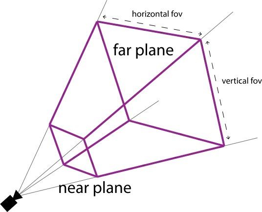 相机模拟真实世界中拍电影的摄像机。相机的位置和方向,确定你通过屏幕看到被渲染出的场景的哪个部分。当你设置一个相机的时候,你需要设置一个垂直的视野(fov),长宽比,一个近平面,一个远平面。这四个值确定一个3D空间(视锥),这个3D空间会被你的相机捕捉到。