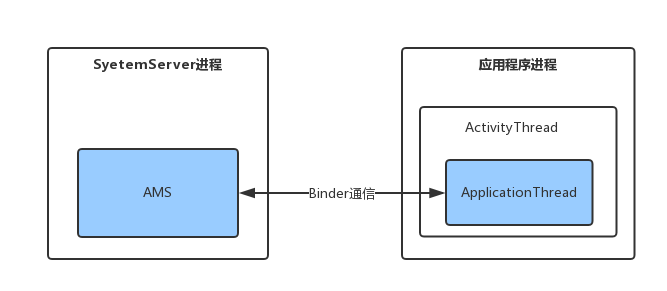 }这里的 app.thread指的是IApplicationThread,它的实现是ActivityThread的内部类ApplicationThread,其中ApplicationThread继承了IApplicationThread.Stub。app指的是传入的要启动的Activity的所在的应用程序进程,因此,注释1处的代码指的就是要在目标应用程序进程启动Activity。当前代码逻辑运行在AMS所在的进程(SyetemServer进程),通过ApplicationThread来与应用程序进程进行Binder通信,换句话说,ApplicationThread是AMS所在进程(SyetemServer进程)和应用程序进程的通信桥梁,如下图所示。