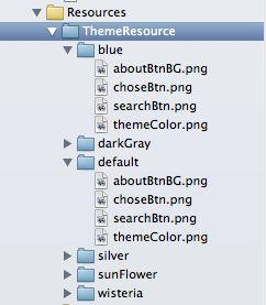 可以看到,通常情况下主题都是预先做好的,当然了,这里因为我没有后端server,如果你的应用是拥有后端server的,那么可以做得更加强大,比如不将主题文件存储在Bundle中,而是存储在应用sandBox的Document中。这样你在应用启动的时候就可以check server 是否有新的主题包,如果有就download下来,释放到Document,这样会方便许多,而不需要在升级之后才能够使用新主题。扯远了,这里可以看到这些文件夹是蓝颜色的,而非黄颜色,可见它不是xcode project的Group,它们都是真实存储的文件夹(它们也是app的bundle的一部分,只是获取的方式有些不同罢了,这样做的目的就是为了方便组织各个主题的文件、目录结构)。