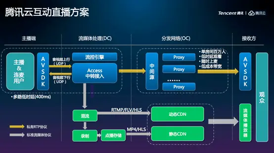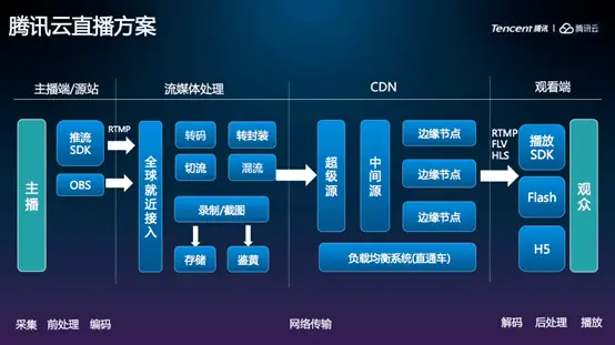 在视频直播、短视频方面,腾讯云通过各种SDK接口,把能力开放出来。在这方面腾讯云提供两套解决方案,第一套方案是标准化的,将主播端/源站、流媒体处理、CDN、观看端打通。