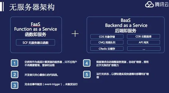 无服务器是今年火起来的一个概念,从结构上来看分为两个部分,一个是后端即服务,是很多人在使用的对象存储、CDB云数据库或者消息队列产品;另外就是函数即服务,也就是腾讯云推出的SCF无服务器云函数产品。