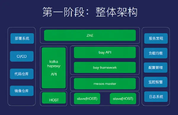 “当时我们面临三个选择,分别是:mesos、k8s和swarm,当时选的是mesos,这是我们第一阶段的整体架构,就是一个PaaS架构,以下是架构图,物理机就是腾讯云提供的物理机。这一阶段只有业务的物理机是进行容器化的,基础组件没有。”