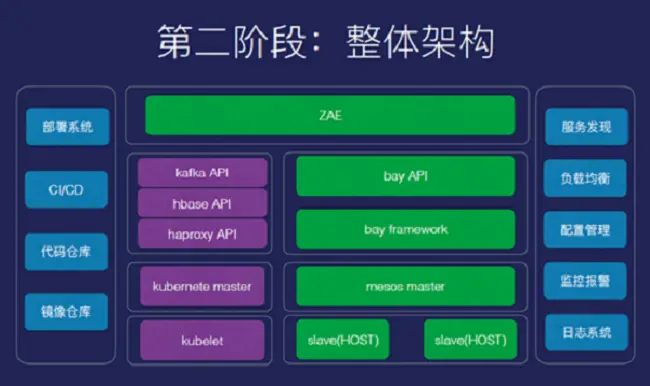 第一阶段初代平台完成之后,主要支持以下几个功能:滚动升级、金丝雀发布、CI/CD完整集成、支撑几乎全部业务(万级容器器)、秒级自动扩容 (10->100 35s)。