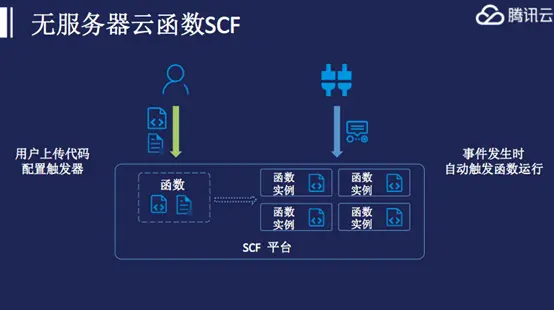 SCF的使用方式或者工作原理,就是用户在最初只要在平台上创建一个函数,把代码或者代码包、库上传上来,同时配置一个触发器。如果你的事件够多,所有的函数都是以并行实例的方式在运行,而这个扩缩容其实也在平台自动完成,而不需要用户关心我究竟要取多少实例,配置多大的资源来控制这些实例。