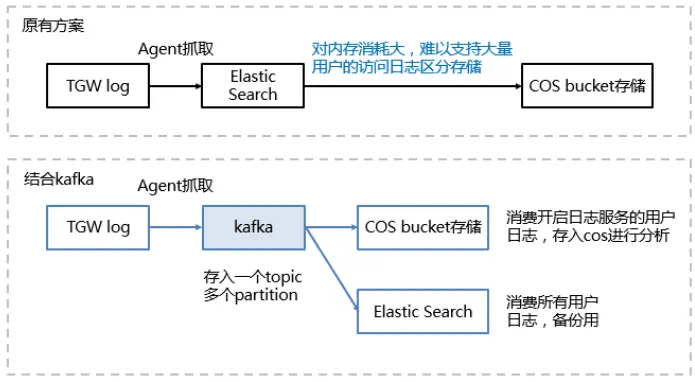 - 针对这个问题,腾讯云的优化方案是先将所有的消息存储在消息中间件当中,如Kafka系统,通过Kafka进行消息解耦,然后将日志信息分别发送给COS bucket和ES系统,缓解资源池的压力。下图是腾讯云大数据日志收集原有方案和改进方案的对比: