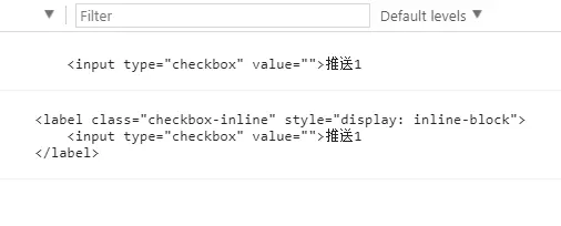 打印台输出checkbox下的html结构,和eq(0)的结果完全一致。var selectHtml = $('.bundBox .checkbox:first()').html(); console.log(selectHtml)<label class="checkbox-inline" style="display: inline-block"> <input type="checkbox" value=""> 推送1 </label> - 来一个直观的有无空格的对比,在编辑器中输入如下