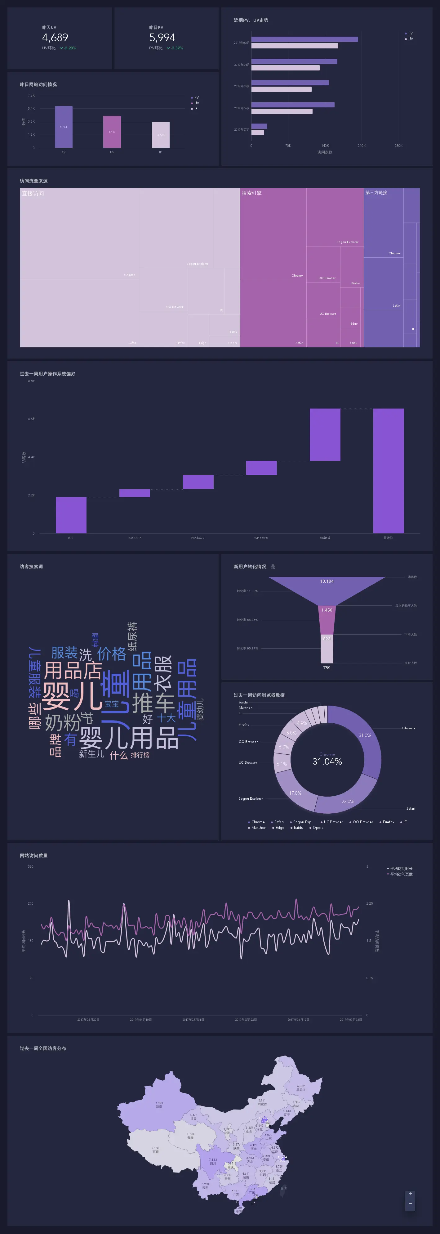 现在,我做运营数据汇报的程序是这样的:找分析师要到固定数据(Excel格式),自己第一次花点时间在BDP制作两个仪表盘:一个周报(如下图,数据涉及到保密,所以我做了一些处理),一个月报,每个仪表盘展现需要展示的数据图表(如每周的PV.UV.每日订单趋势等,会有折线图、柱状图、指标卡、漏斗图、词云等图表);操作也不难,拖拽字段就能展示不同的图表效果。