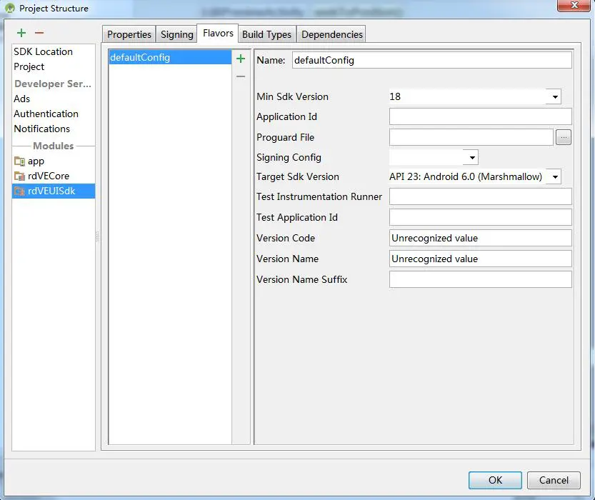 之后点击File--->Project Structure,选择你自己工程的Module,在Flavors选项卡中设置Min Sdk Version 不低于18