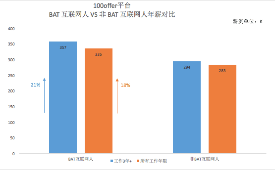 可以看出,无论工作几年,BAT 互联网人的薪资水平普遍高于非 BAT 互联网人,且工作越久两者在薪资上的差距越明显。