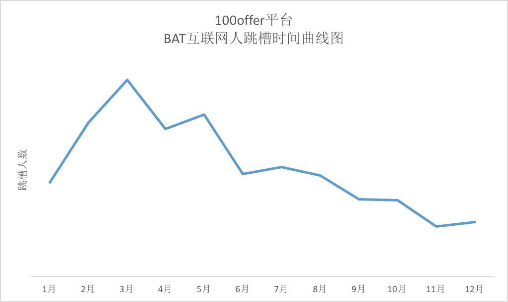 由于部分 BAT 年终奖会在 4 月发放,所以领完年终奖的 5 月再次迎来一个跳槽高峰。5 月后一直到年前,BAT 人的跳槽人数一直相对比较稳定。