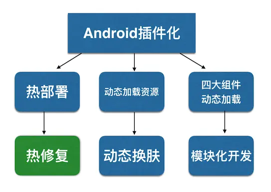 首先需要明确的一点,插件化和热修复不是同一个概念,虽然站在技术实现的角度来说,他们都是从系统加载器的角度出发,无论是采用hook方式,亦或是代理方式或者是其他底层实现,都是通过“欺骗”Android 系统的方式来让宿主正常的加载和运行插件(补丁)中的内容;但是二者的出发点是不同的。插件化顾名思义,更多是想把需要实现的模块或功能当做一个独立的提取出来,减少宿主的规模,当需要使用到相应的功能时再去加载相应的模块。热修复则往往是从修复bug的角度出发,强调的是在不需要二次安装应用的前提下修复已知的bug。