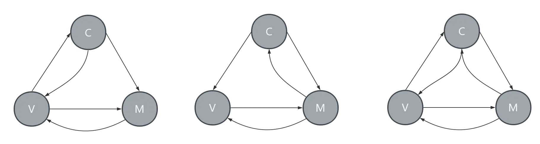1、Controller -> Model 2、Model -> View 3、View -> Model