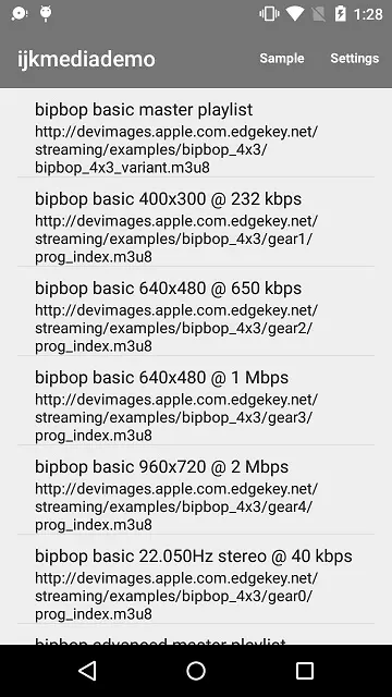 git clone https://github.com/Bilibili/ijkplayer.git下载ijkplayer完整项目,然后使用Android Studio打开目录:ijkplayer\android\ijkplayer,这个是Android的Demo项目,运行之后,效果如下: