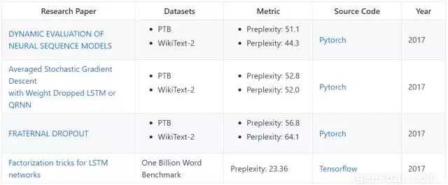 以下展示了语言建模方面当前顶尖的研究成果及它们在不同数据集上的性能。