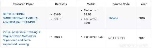 第二篇论文提出了一种基于虚拟对抗损失的新正则化方法:输出分布的局部平滑度的新测量手段。由于平滑度模型的指示是虚拟对抗的,所以这一方法又被称为虚拟对抗训练(VAT)。VAT 的计算成本相对较低。本文实验在多个基准数据集上把 VAT 应用到监督和半监督学习,并在 MNIST 数据上取得了 Test Error 1.27 的优异表现。