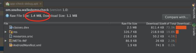 这里我们可以看到debug包都是1.4M,而release包都是0.7M,显然,我们的混淆和压缩配置是生效了的,虽然这里我并没写混淆规则