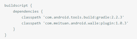 (1) 在位于项目的根目录 build.gradle 文件中添加Walle Gradle插件的依赖, 如下: