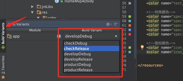 develop、check、product,如果直接run代码,怎么设置默认的环境?点击查看AndroidStudio左下角的BuildVariants,然后选择设置默认的run环境即可。