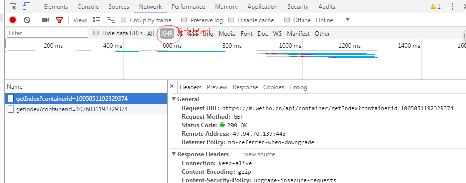 这里是谢娜微博的主页,接着我们看获取主页时调用的接口