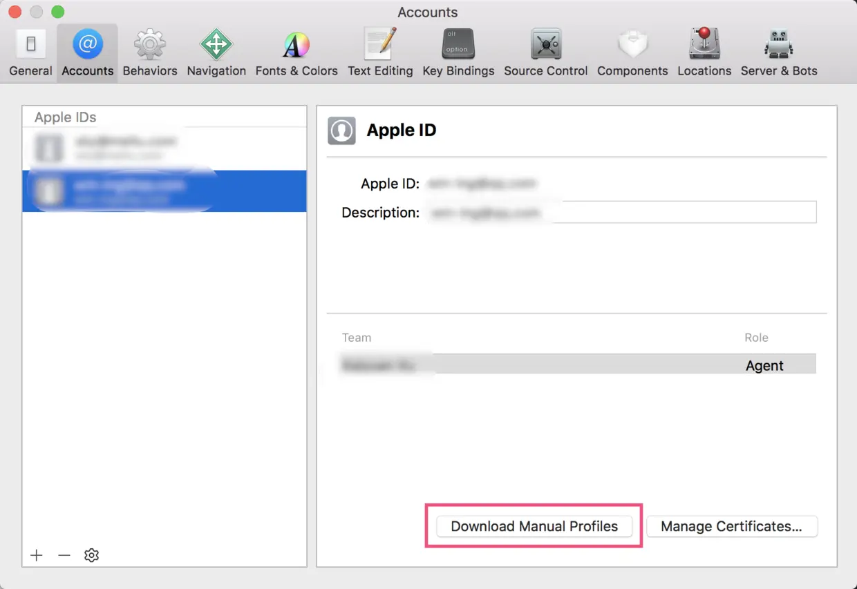 ~/Library/MobileDevice/Provisioning这个路径下删除所有内容(注:如果你同时管理了多个 AppleID 或者有一些无法通过 AppleID 自动同步的 provisioning profile 要防止误删) - 如下图,在 Xcode 偏好设置里面点击 Download Manual Profiles 把云端管理的 provisioning profile 下载到 Xcode