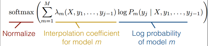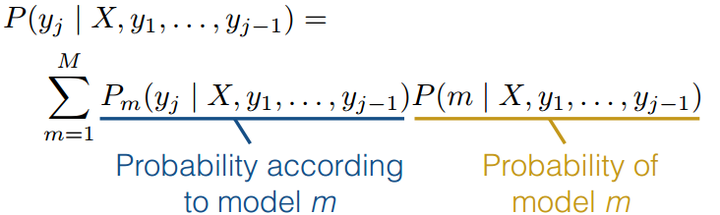 上图可以看到,每个模型我们都赋予了一个概率值,如果不考虑模型的重要程度,我们可以认为模型的取值概率为一个均匀分布(即进行M个模型的融合,那么取到每个模型的概率即为1/M)。上式可以看成对于一个单词的生成概率,是由M个模型共同决定的,也是加权平均的一种变形。