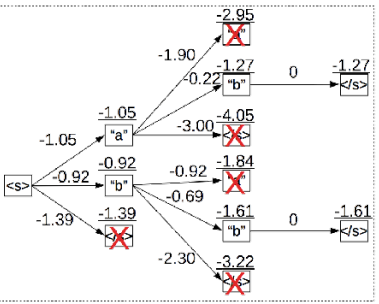 比起贪心法只取一个使P概率最大的单词,Beam Search每生成一个单词,都会随之产生一个代价值,这个代价值一旦超过了设定的阈值,那么就终止这条候选语句的产生。从图2-3可以看到,当最终生成终止符时,保留2个候选语句,此时再根据上下文来最终决定应该选择哪一条语句作为输出。