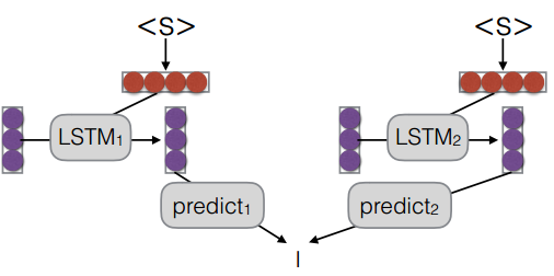 在前2个部分中,我们都是在已经默认P(Y|X)已经给定的情况下进行讨论的,但是,Conditioned LM最重要的部分也就是词语的概率分布表示,每一个模型都有优劣,那么能否将不同模型的优点都抽取出来进行融合集成呢?答案是肯定的。下图表示了LSTM1和LSTM2的分别预测值,集成后得到最终的预测值。
