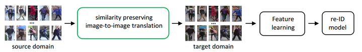 假设给定源域 S(source domain)上带标签的数据集合,以及目标域 T(target domain)上没有带标签的数据集合。迁移学习的目标是让在S域上训练的re-ID模型能很好地在T域上应用。为此,该论文提出“Learning via Translation”的框架。