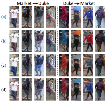 图5展示了不同模型在Marke和Duke图像之间风格相互迁移的效果图:(a)为输入图像、(b)为cyclegan模型的效果图、(c)为CycleGAN+ 效果图、(d)为SPGAN的效果图。可以看出
