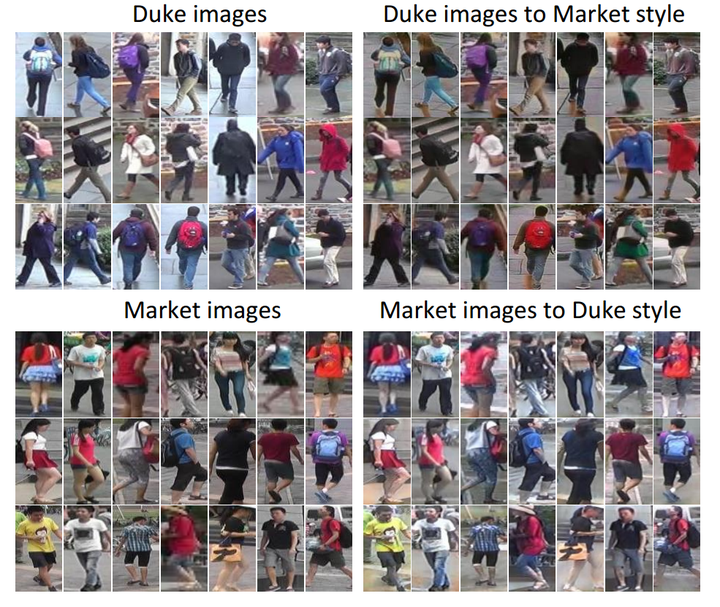 相比于CycleGAN,在Duke上性能基本持平而在Market上性能表现更好一些,原因可能是Duke-->Market的时候难度稍微大一些,