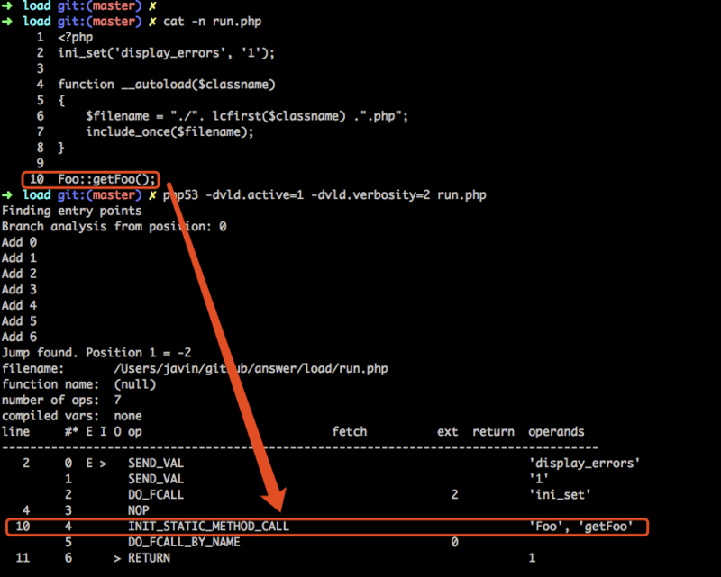 我们看到,PHP 运行到第 10 行时,所生成的 opcode 为:INIT_STATIC_METHOD_CALL,两个操作数都为常量(CONST)。
