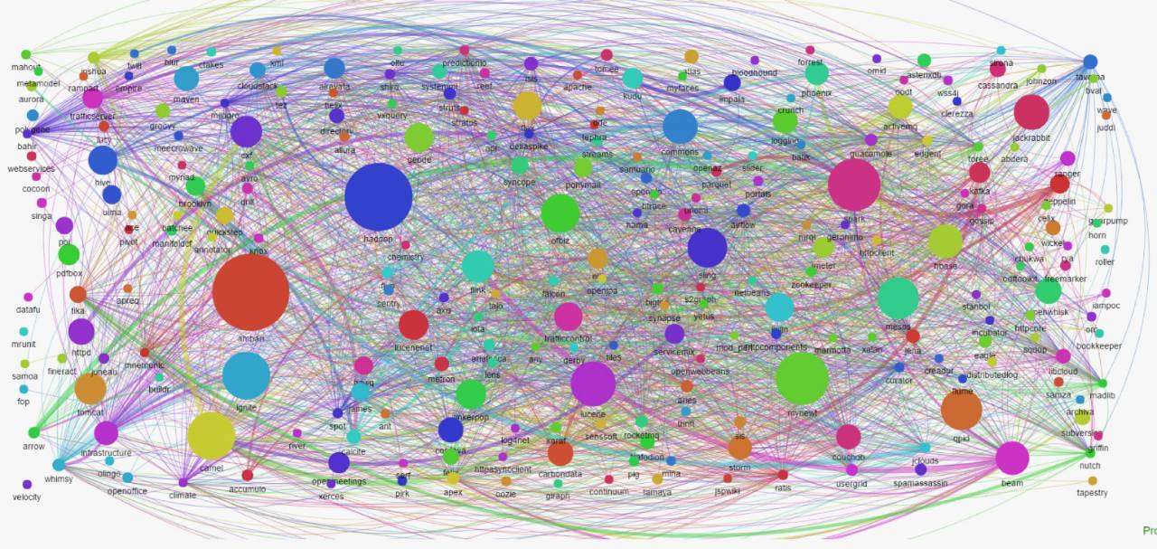和这个世界上很多的哲学体系一样,技术概莫能外。实现某种功能可能有无数种方式,开源的项目之间相互引用、借鉴、学习,于是乎整个Apache项目之间的关系亦是错综复杂的,如下图所示,