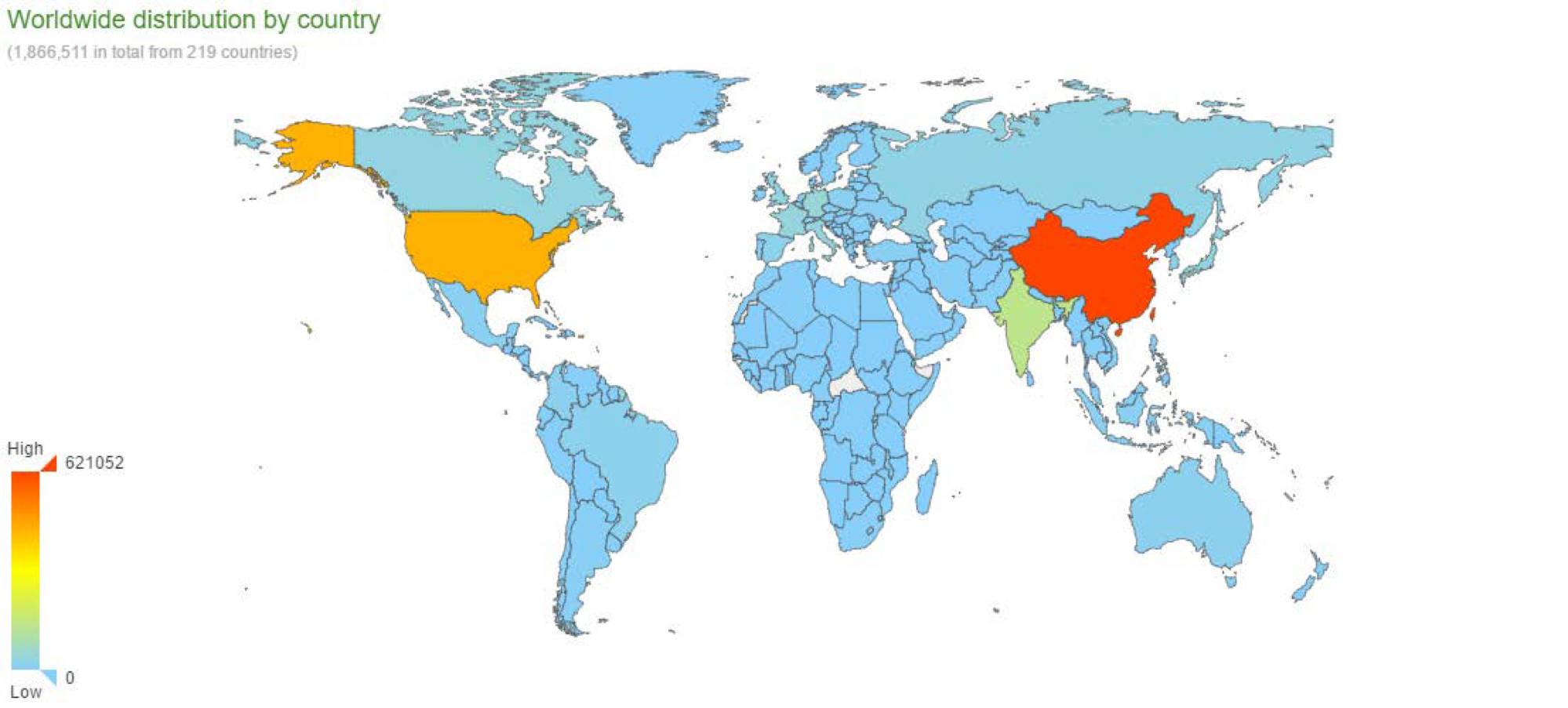 首先我们关注的是,分布在这个世界上的国家,都有哪些国家在使用Apache的项目,根据下载量的分布,我们获得如下图所示的内容: