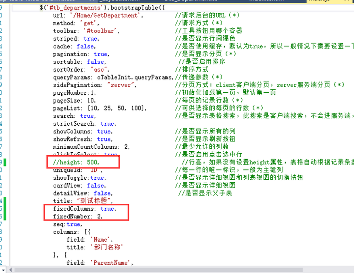 加两个参数fixedColumns和fixedNumber即可,什么意思不用过多解释,是否冻结列、冻结列的列数。还有一点需要说明的是,这里调用的时候不能指定它的height,如果指定height,表格的冻结显示会有问题。