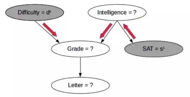 尽管我们没有可以给我们直接提供信息的 CPD,但我们可以看到有高 SAT 分数的学生说明该学生智力水平也很可能较高;由此,如果该课程的难度很低,那么该学生得到好评级的概率也会较高,如上图中的红色箭头所示。我们可能也想同时估计多个变量的概率,比如学生同时得到好评级和好推荐信的概率?