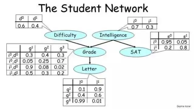- 学生的 Grade 取决于课程的 Difficulty 和学生的 Intelligence;