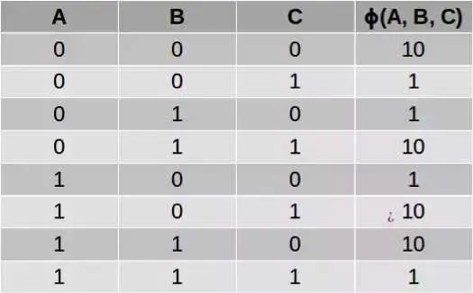 这样得到的表格被称为「因子(factor)」或「势函数(potential function)」,使用希腊字母φ 表示。比如,我们可以使用下面的势函数来描述变量 A、B 和 C 之间的关系,其中 C 是 A 和 B 的「软」异或(XOR),也就是说:如果 A 和 B 不一样,那么 C 很可能为 1;如果 A 和 B 一样,那么 C 很可能为 0: