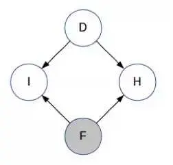 注意箭头的方向——D 和 F 是相互独立的,I 显然依赖于 D 和 F,主持人选择的门也取决于 D 和 F。目前你对 D 还一无所知。(这与学生网络的结构类似,即知道学生的智力水平不能让你获得有关课程难度的任何信息。)
