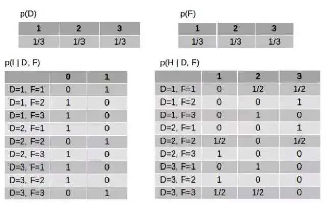 D、F 和 H 可取值为 1、2 或 3;I 可取值 0 或 1。D 和 I 是未被观察到的,而 F 是已观察到的。在主持人打开其中一扇门之前,H 都是未被观察到的。因此,我们使用贝叶斯网络来解决我们的问题: