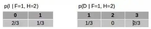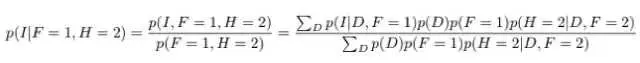 现在,主持人打开了 F 之外的另一扇门,所以我们观察到了 H。假设 H=2。让我们再计算给定了 F 和 H 时 I 和 D 的条件概率。